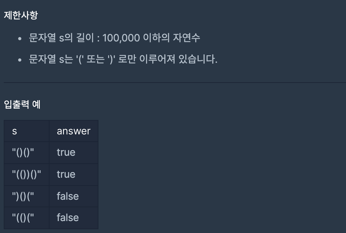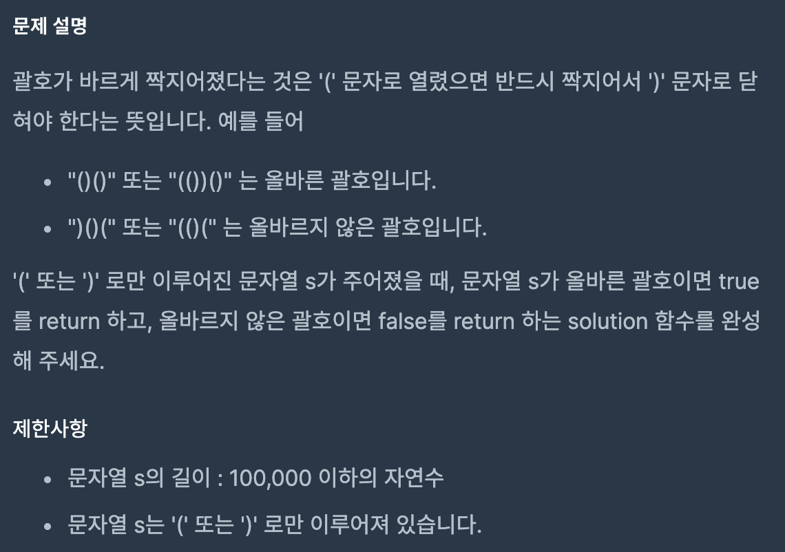 괄호가 바르게 짝지어졌다는 것은 '(' 문자로 열렸으면 반드시 짝지어서 ')' 문자로 닫혀야 한다는 뜻입니다. 예를 들어 "()()" 또는 "(())()" 는 올바른 괄호입니다. ")()(" 또는 "(()(" 는 올바르지 않은