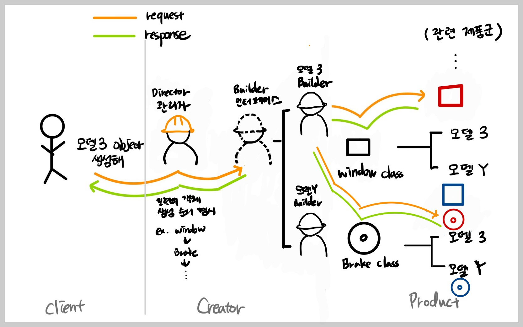 - 장점 : 복잡한 오브젝트의 생성 과정을 클라이언트가 직접 다룰 필요 없음
