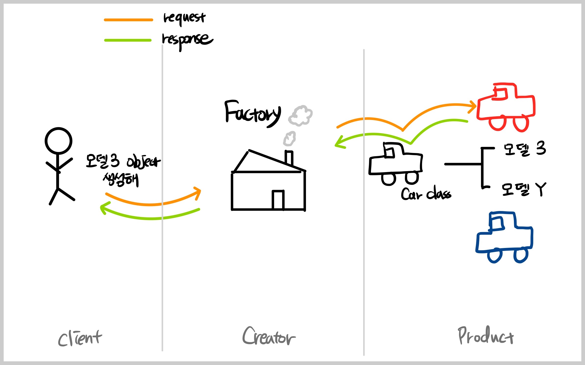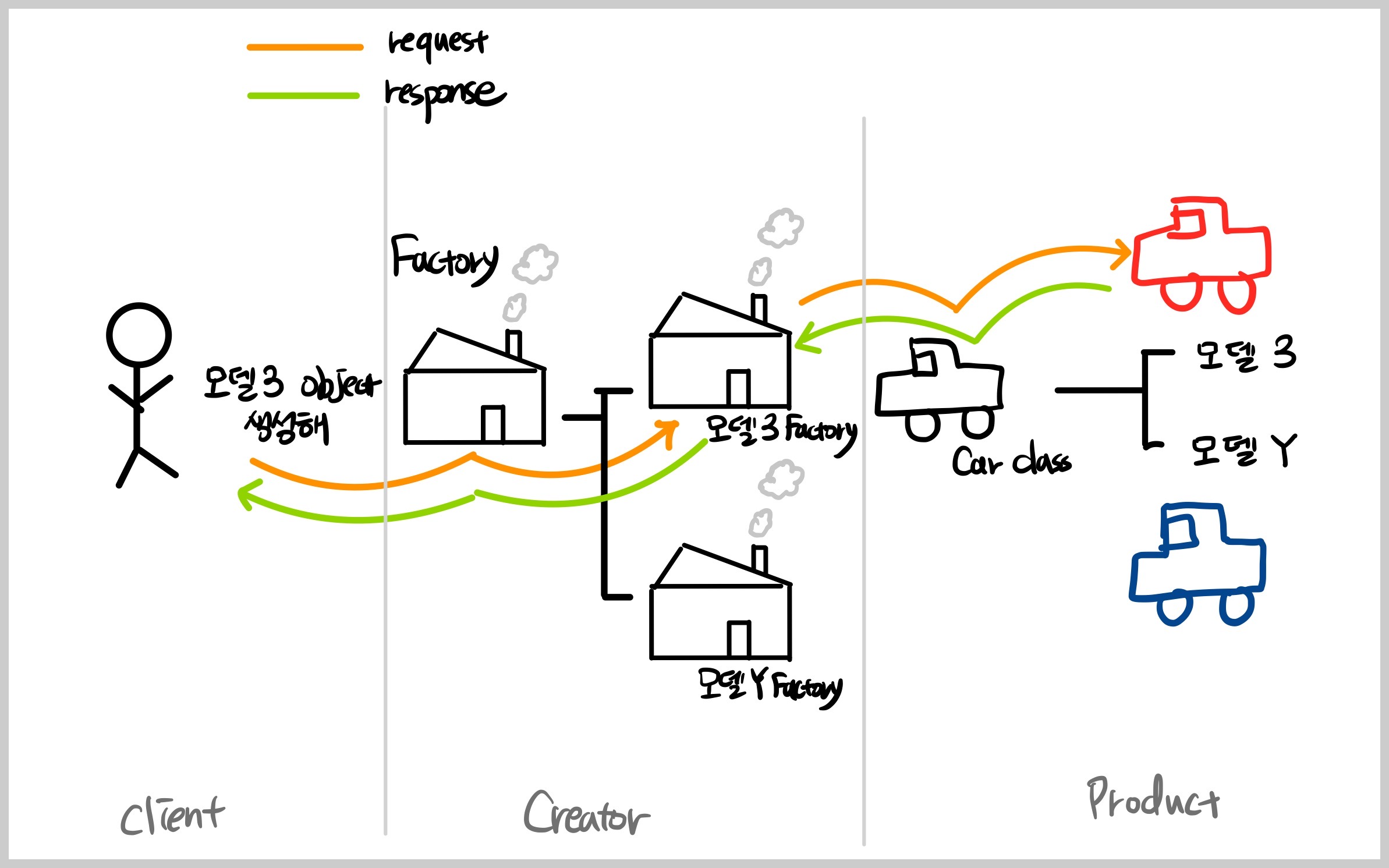 - 오브젝트 생성 과정은 모두 팩토리 안에 숨겨놓고 클라이언트는 "테슬라 모델3 만들어주세요" "테슬라 모델Y 만들어주세요"를 요청하면 팩토리가 필요한 오브젝트를 생성하여 return