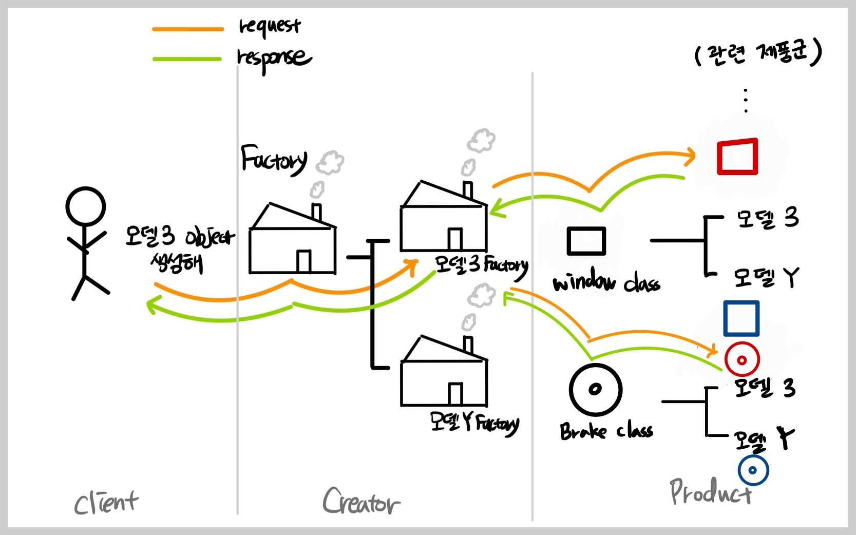- 팩토리 메서드 일 때 Client : 모델3 브레이크 객체 만들어주세요, 모델3 윈도우 객체 만들어주세요, ...